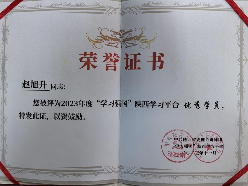 我校赵旭升老师获“学习强国”陕西学习平台优秀学员