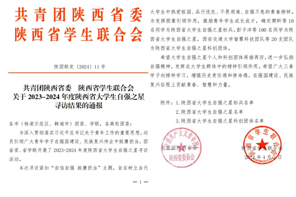 近日,团省委、省学联公布了2023-2024年度陕西省大学生自强之星获奖名单,我校经济与贸易学院学生王家乐荣获“陕西省大学生自强之星标兵”称号,信息工程学院赵雯荣获“陕西省大学生自强之星”荣誉称号。