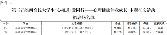 530日,陕西省委教育工委公布了2024年第九届陕西高校心理育人宣传季活动表扬名单,我校学生朱洁琼获第三届陕西高校大学生“心相遇 爱同行——心理健康伴我成长”主题征文活动一等奖,杜正荣获二等奖。心理教师计敏敏获陕西高校学生心理健康教育指导典型案例二等奖、雒淼淼获三等奖。