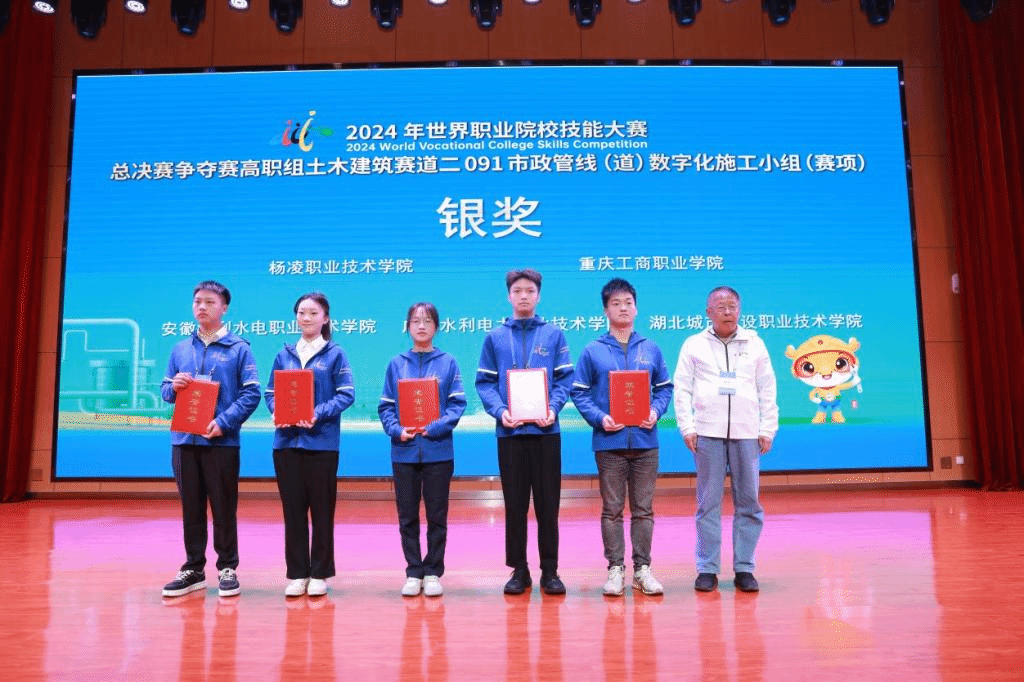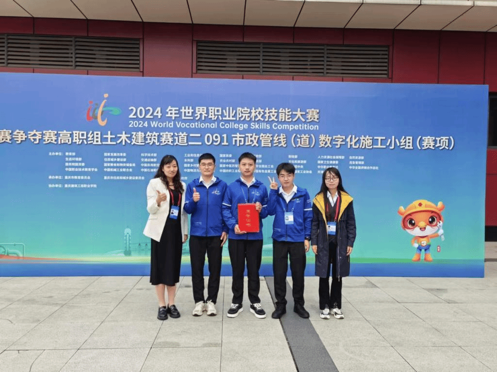 10月25日至26日,2024年世界职业院校技能大赛市政管线数字化施工赛项全国总决赛争夺赛在重庆建筑工程职业学院成功举办,共有来自全国省、自治区、直辖市的57支队伍参赛。我校建筑工程学院由教师彭燕、郭超指导,麻晨翔、时健、王晓光组成的学生团队,凭借扎实的专业技能、良好的团队协作能力、职业素养和创新意识,荣获银奖。