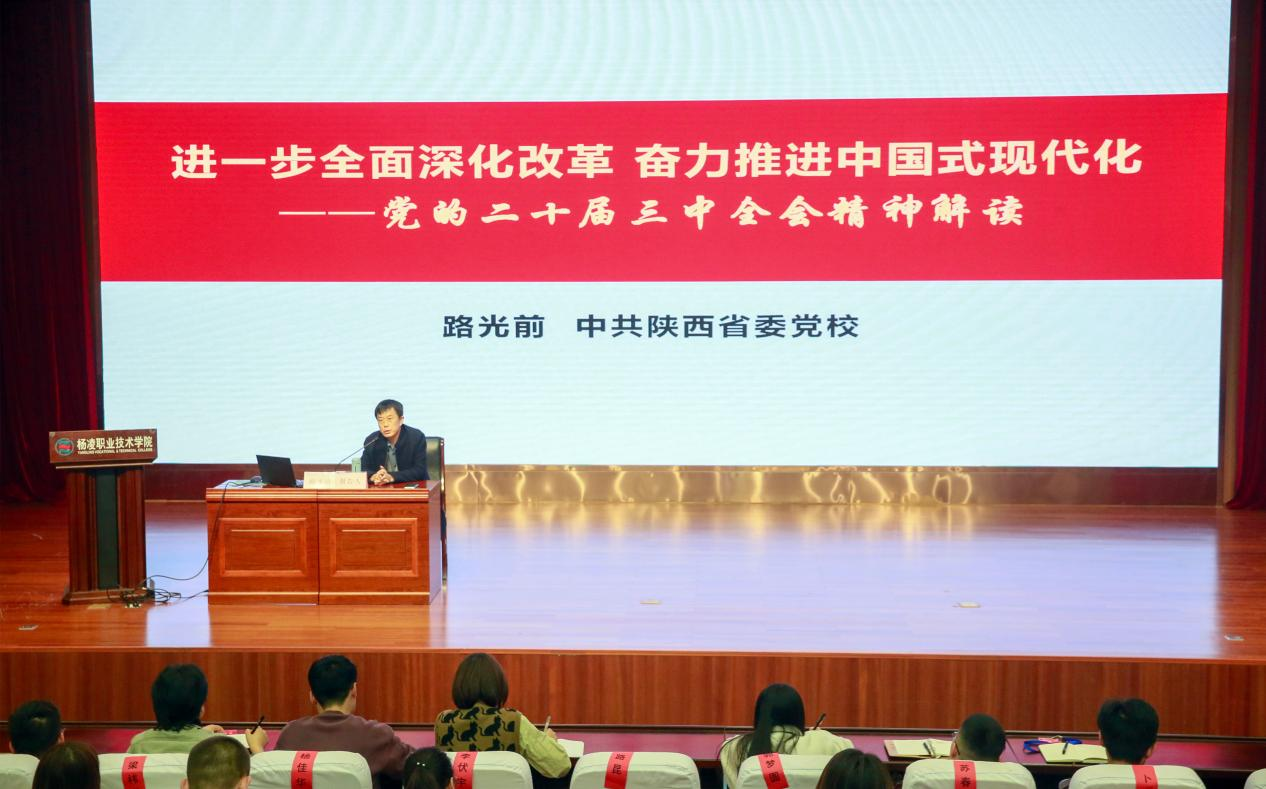 开班仪式上,路光前以“进一步全面深化改革 奋力推进中国式现代化——党的二十届三中全会精神解读”为题作专题报告。他结合杨陵区干部队伍建设实际情况,从进一步全面深化改革的重大意义和总体要求、聚焦重点在更高水平上进一步全面深化改革、提高党对进一步全面深化改革的领导水平等方面进行了系统阐述,对全面加强党的领导、完善党的领导方式和执政方式等作了深入解读。