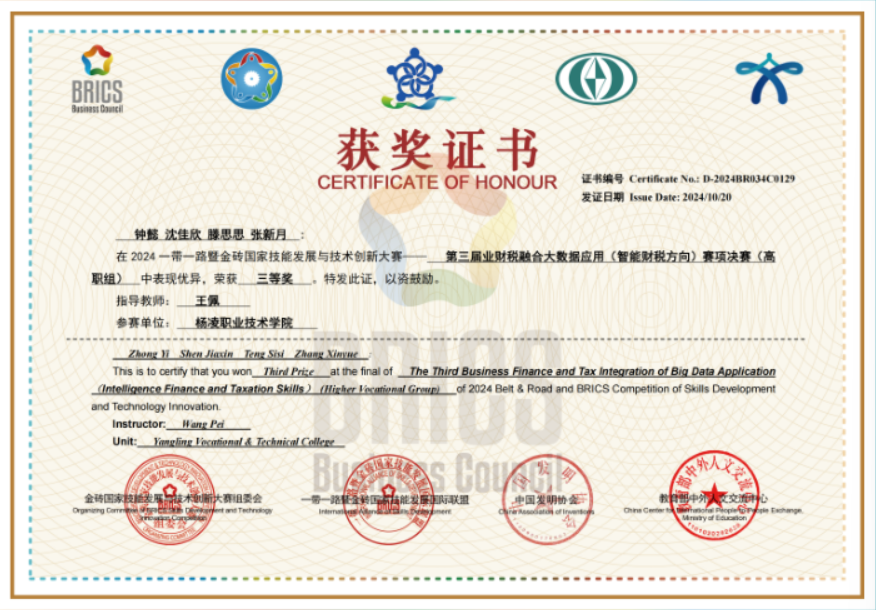 9月20至22日,由金砖国家工商理事会中方理事会与教育部中外人文交流中心联合主办,安徽审计职业学院承办的2024一带一路暨金砖国家技能发展与技术创新大赛——第三届业财税融合大数据应用(智能财税方向)赛项国内决赛落下帷幕。共有来自全国58支高职院校代表队参加,我校经济与贸易学院钟懿、沈佳欣、腾思思、张新月等四名学生获高职组团队赛三等奖。
