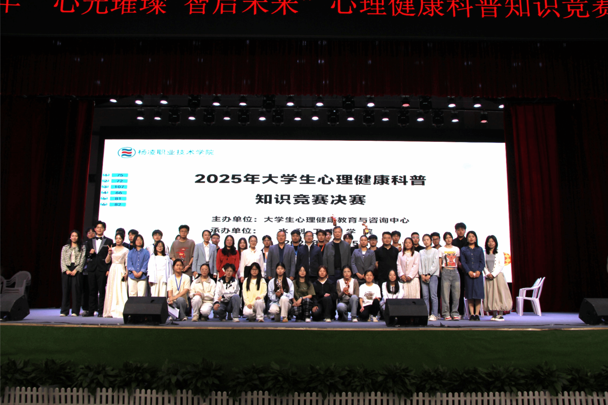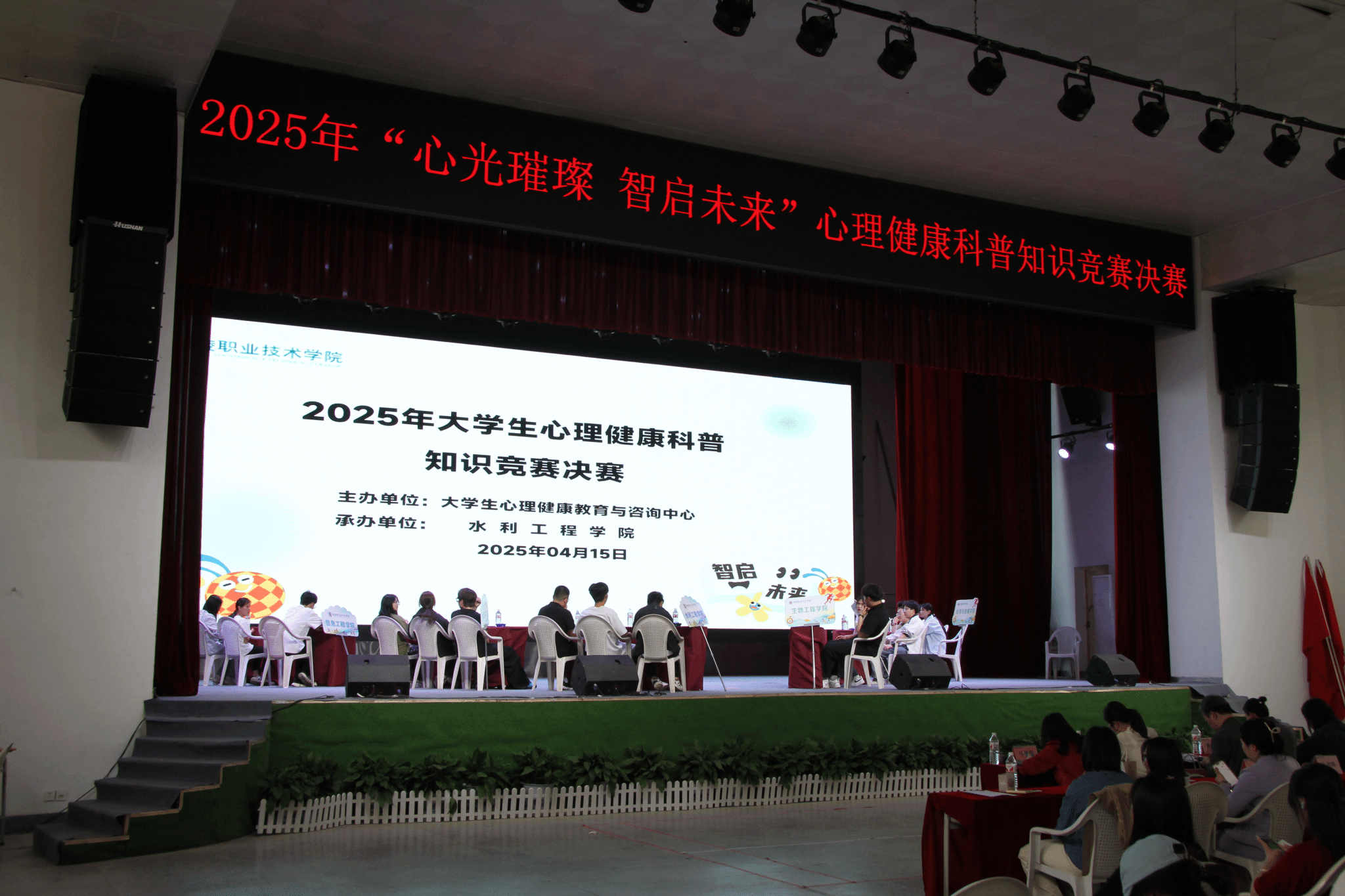 4月15日下午,学校举办2025年“心光璀璨 智启未来”大学生心理健康科普知识竞赛决赛。比赛由大学生心理健康教育与咨询中心主办、水利工程学院承办,马克思主义学院、大学生心理健康教育与咨询中心教师担任评委。副校长张朝晖,水利工程学院党总支书记,各学院学工办主任、相关辅导员和学生代表共计200余人观摩大赛。