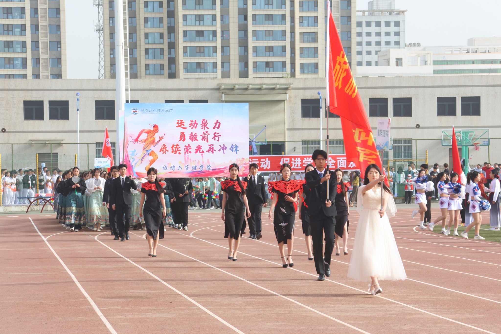 4月22日上午8点30分,伴随着气势磅礴的《运动员进行曲》,国旗护卫队、军鼓队、腰鼓方阵、花束方阵、扇子方阵、彩旗林队、裁判员方阵和各二级学院代表队依次入场。国旗飘扬,鼓声激昂,鼓点铿锵,青年学子精神抖擞、意气风发。扇子舞灵动飘逸,花束方阵尽显青春活力,广播体操表演动作规范、整齐划一。他们精神饱满、朝气蓬勃,展现着杨职人奋斗不息的深厚底蕴与敢为人先、团结协作、追求卓越的体育精神。