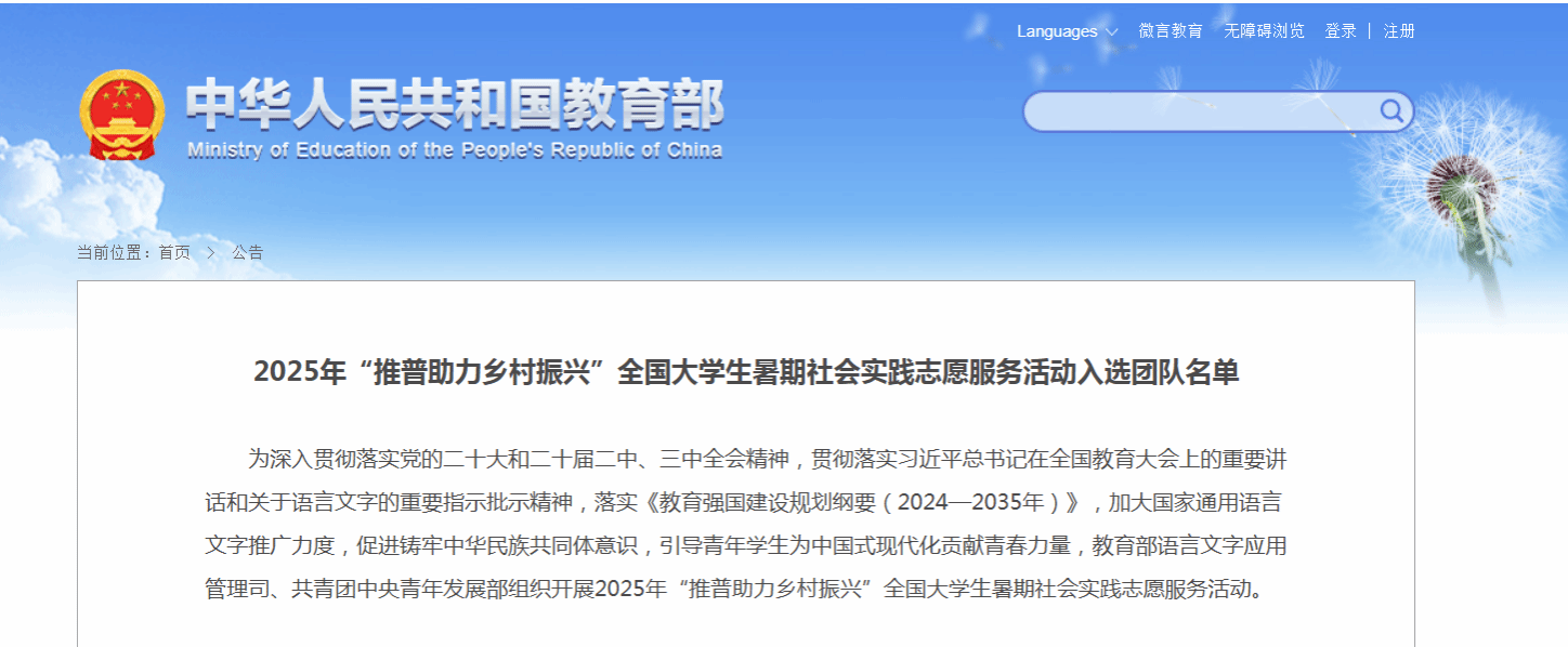 近日,由教育部语言文字应用管理司、共青团中央青年发展部组织开展的2025年“推普助力乡村振兴”全国大学生暑期社会实践志愿服务活动公布了入选团队名单,我校5支团队首次成功入选。