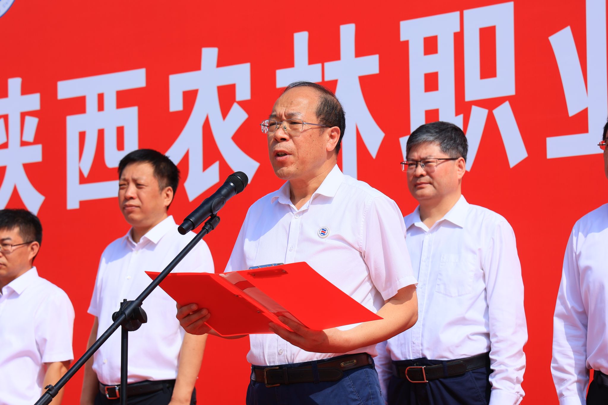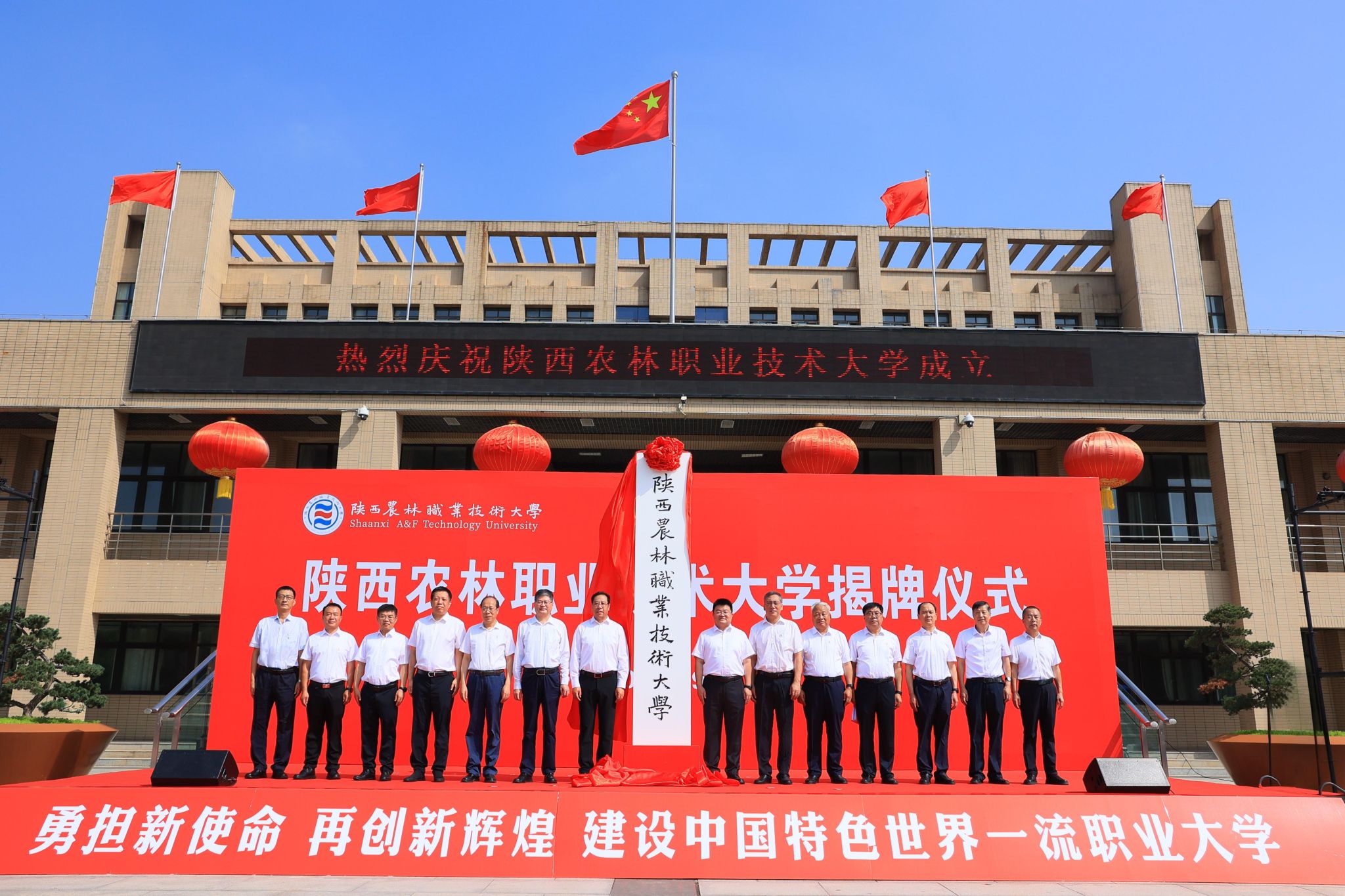 西北农林科技大学党委书记黄思光,杨凌示范区党工委书记史高领,省委教育工委委员、省教育厅副厅长吴振磊,杨凌示范区党工委委员、杨陵区委书记李函,杨陵区委副书记、区长李朝喜;学校党委书记韩明军,校长仲伟周,原党委书记王周锁,党委副书记、纪委书记王勇胜,副校长祝战斌、蒋平江、胡俊鹏等出席揭牌仪式。省教育厅、杨凌示范区、西北农林科技大学、杨陵区有关领导,学校校友及师生代表230余人,共同见证学校跨越发展的历史性时刻。揭牌仪式由学校党委副书记刘瑞明主持。