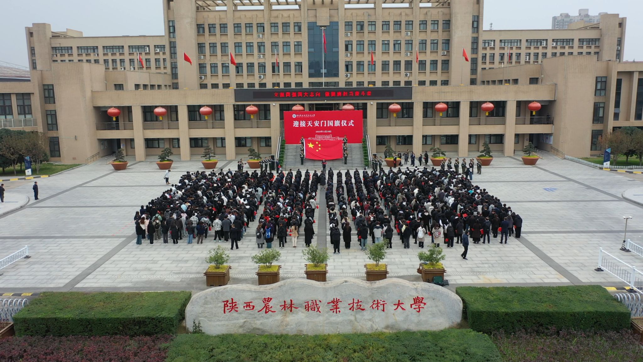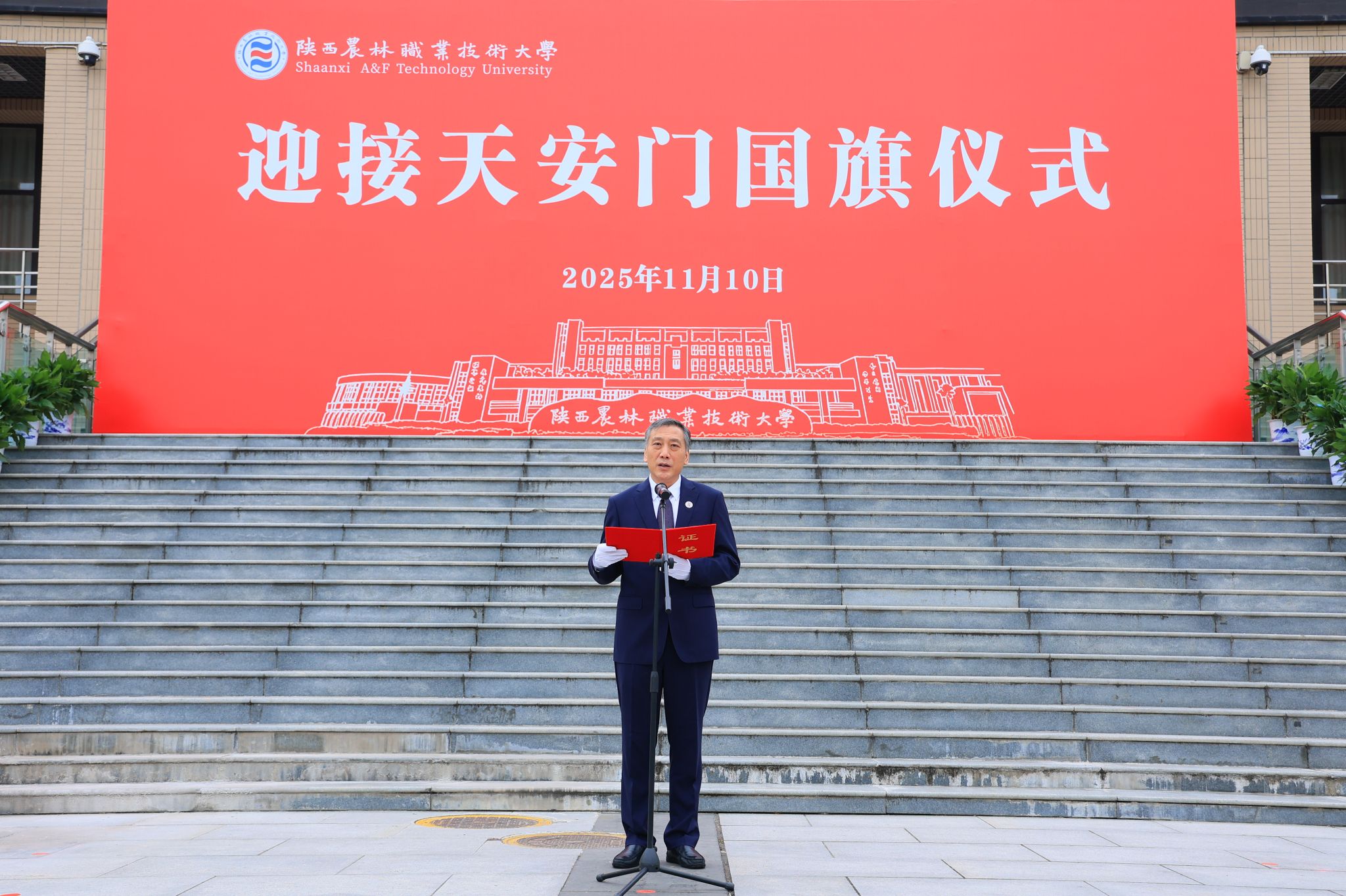 校长仲伟周在讲话中指出,学校自诞生之日起,就植入了红色基因、流淌着红色血液、饱含着爱国深情。建校91年来,始终秉承“经国本、解民生、尚科学”办学理念和“造就西北有志农林者”办学初衷,走出了一条“坚守职教定位、扎根三秦大地、服务国家战略”的特色办学之路,为推动我国农业现代化建设和农业职教事业发展作出了重要贡献。他强调,学校将充分发挥天安门国旗的爱国主义教育特殊载体功能,激发全校师生的爱国情怀、强国使命、兴农担当。他希望,全体师生要赓续红色基因,大力弘扬爱国主义精神;矢志强农报国,奋力书写服务祖国新篇;挺膺实干奋进,努力担当技能强国重任。要以更高的历史站位、更远大的办学理想、更昂扬的斗志作风,在奋力建设中国特色世界一流职业大学,奔赴充满光荣和梦想的新征程上,续写学校事业高质量发展的恢弘新篇章。