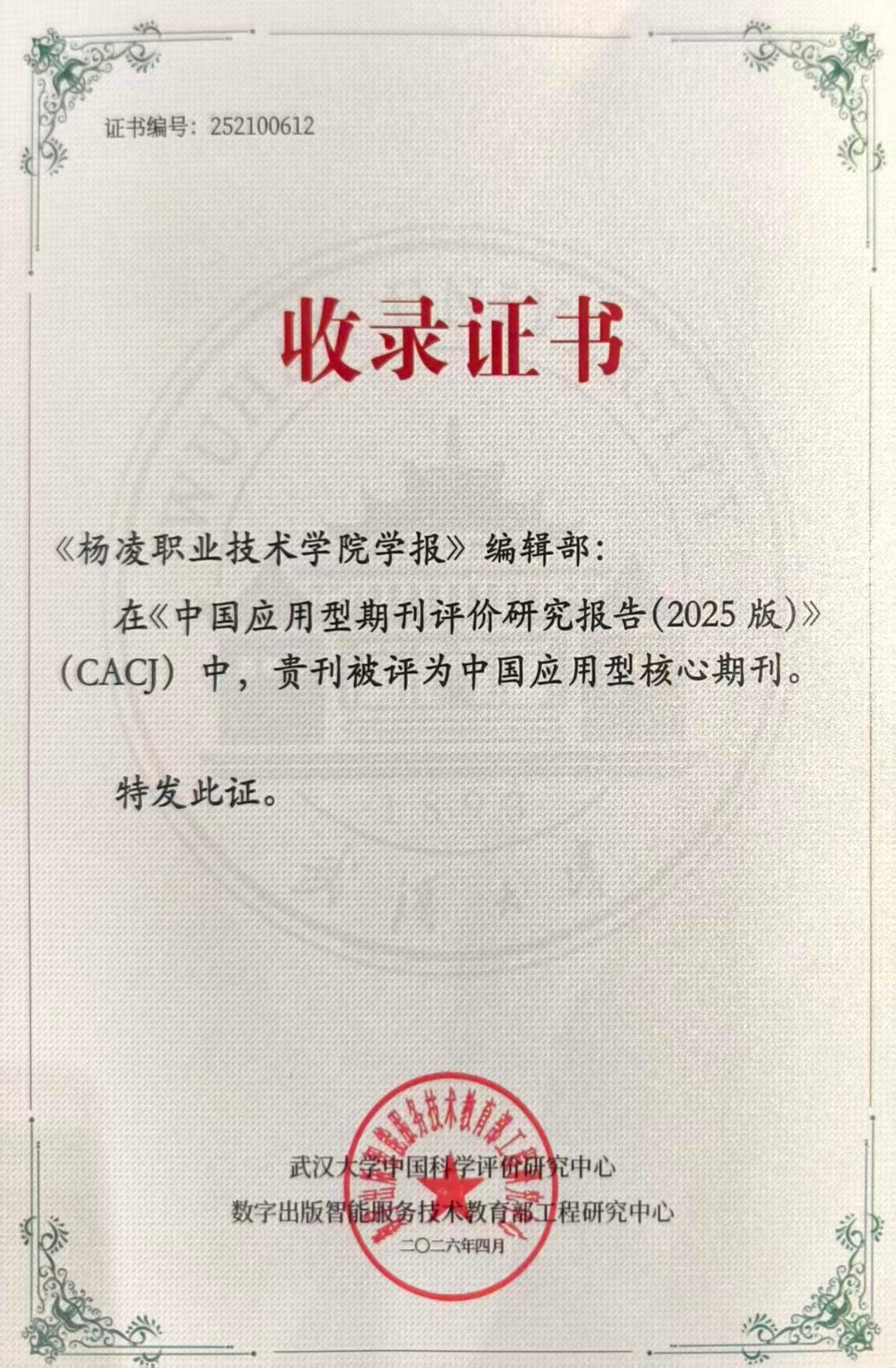 《杨凌职业技术学院学报》在社会科学综合应用领域类别中获评核心期刊,这是学报继CACJ评价报(2023版)后再度入选核心期刊。此次入选,标志着《杨凌职业技术学院学报》(现更名为《电子游艺官网学报》)的学术质量、办刊质量、行业影响力和应用价值获得权威评价机构的持续认可,也充分彰显了学校发展中软实力和影响力的不断提升。学报编辑部将以此为契机,继续坚持“内容质量第一”的宗旨,深耕应用型研究,为推动学术创新和行业技术进步作出更大贡献。