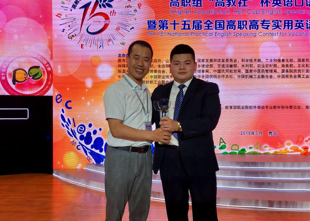 5月28日至31日,2019年全国职业院校技能大赛英语口语赛项暨第十五届全国高职高专实用英语口语大赛在山东青岛山东外贸职业学院举行。我院旅游与管理分院应用英语专业17023班赵小虎同学经过三轮比拼,获得英语专业组全国总分第三,全国总决赛一等奖,这也是我院人文社会职业能力竞赛的历史性突破。
