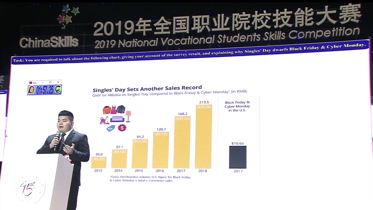本次全国总决赛汇集了全国各省市省赛第一、二名共57位非英语专业选手和28位专业选手。赵小虎同学以省赛第一名的优异成绩代表陕西省参加今年的全国总决赛。本赛项是对选手商务英语水平的大考验和英语技能的大比拼,共包括职场描述(presentation)、情景交流(interview)和职场辩论(debate)三个环节,实行积分排名和淘汰赛制,最终产生三名英语专业组全国一等奖。
