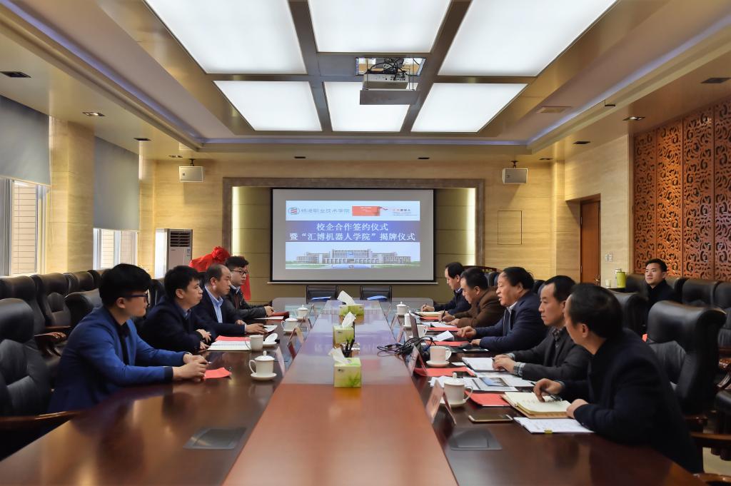 3月11日下午,我院与江苏汇博机械人技术股份有限公司校企合作签约仪式暨汇博机器人学院(杨凌分院)揭牌仪式在南校区醒钟楼208会议室举行。院长王周锁、副院长张永良,江苏汇博机器人技术股份有限公司总裁王振华,学院教务处、机电工程分院负责人,及有关教师参加签约仪式。签约仪式由副院长张永良主持。