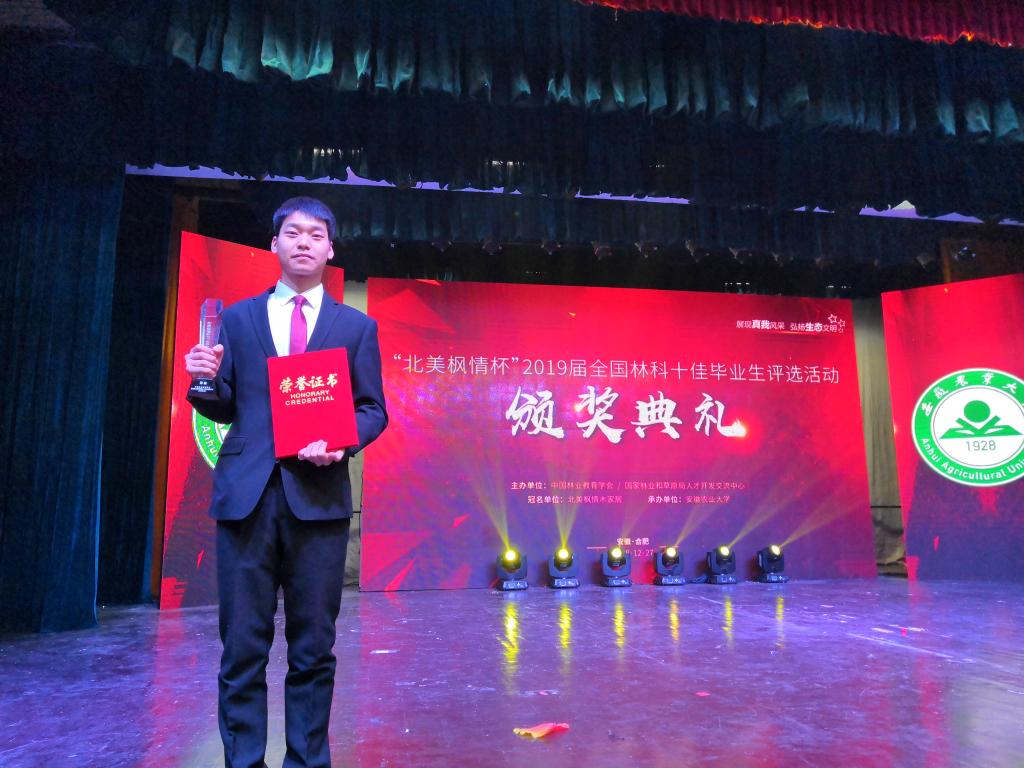 12月27日,由中国林业教育学会和国家林业局人才开发交流中心共同举办的“北美枫情杯”2019届全国林科十佳毕业生评选表彰大会举行。我院生态环境工程分院园林工程16054班学生郭强荣获高职组“全国林科十佳毕业生”称号,园林规划设计16033班丁玉洁、朱文涛和何伟伟三位同学荣获高职组“全国林科优秀毕业生”称号。