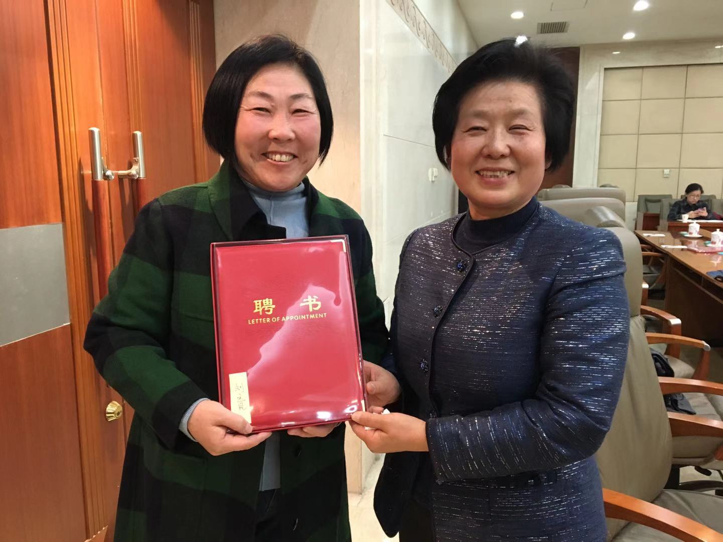 陕西省人民代表大会常务委员会副主任朱静芝同志(右)为刘玉凤教授颁发聘书