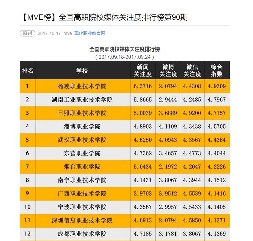 全国高职院校媒体关注度排行榜