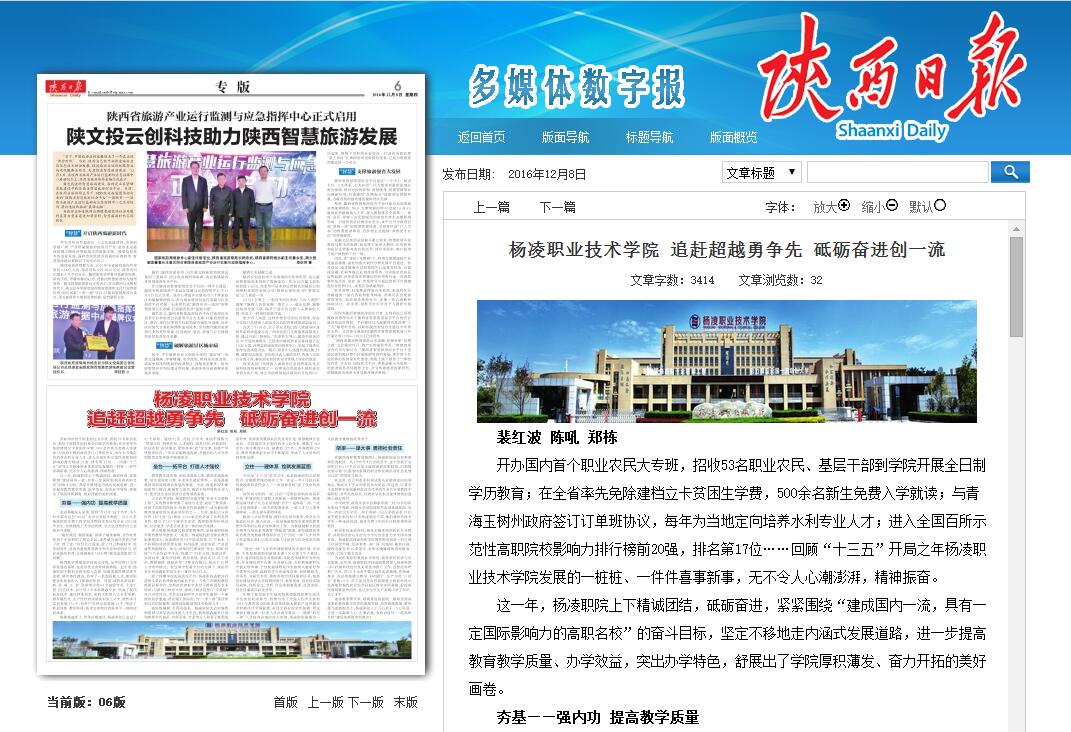 12月8日,《陕西日报》6版以《杨凌职业技术学院:追赶超越勇争先 砥砺奋进创一流》为题,对我院如何突出办学特色、建设“一流高职名校”进行了报道,全文刊载如下(详情进入):