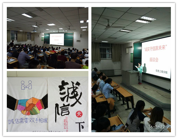 励志心、成才梦,做诚信大学生。5月22日晚,信息工程分院在南校区醒钟楼NOB-103阶梯教室举办了“诚实守信赢未来”主题演讲暨座谈会,分院全体专职辅导员及一年级各班主任及150余名学生代表参加。