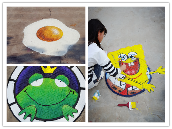 本次比赛,在前期准备中,参赛选手通过3D涂鸦、萌化和拟人化等多种形式,将作品手绘于图纸上,由指导老师筛选出了三十余幅作品;在比赛中,选手们拿出准备好的图案用颜料或喷漆一点一点的在井盖上渲染着,很快就把井盖彩绘成各种图案,使原本单调的井盖变得生动。