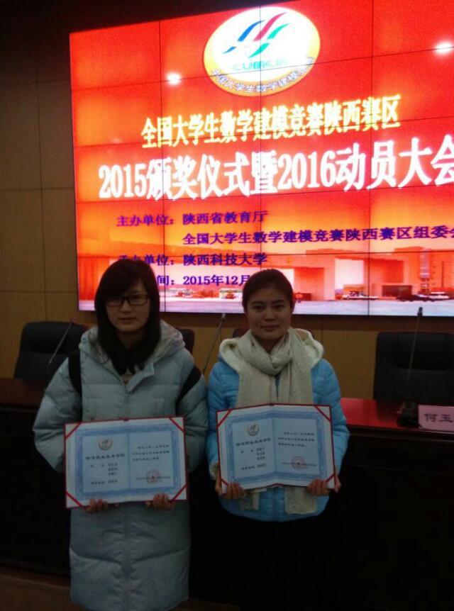 近日,2015年全国大学生数学建模竞赛成绩揭晓,我院连续第五年斩获国家级奖项,梁颖宇、苟美春、蒋凯凯三位同学组成的代表队荣获专科组国家二等奖;徐智、高佳翔、赵雨杭三位同学组成的代表队荣获专科组陕西赛区一等奖;郭帅帅等九位同学组成的3支代表队分别荣获专科组陕西赛区二等奖。