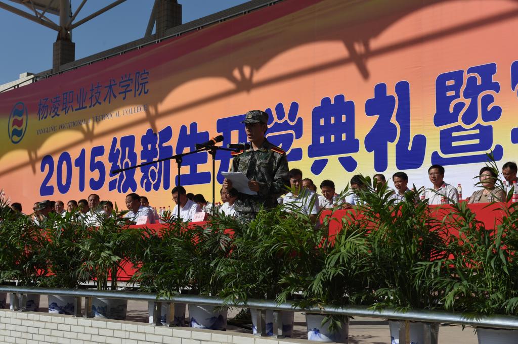 院长王周锁在讲话中首先代表学院党委、行政和全院20000余名师生员工对2015级新同学表示热烈的欢迎,向承担本次军训任务的执训官兵表示崇高的敬意。他简要回顾了学院的发展历程,介绍了近年来学院的发展概况及办学优势,特别是在专业建设、教学改革、校内外实习、实训基地建设等方面取得的成就。