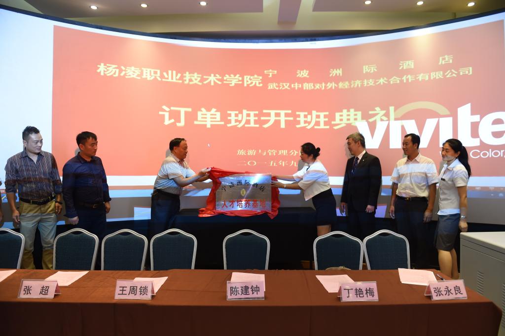 开班仪式上,王周锁与两家企业的负责人共同为“宁波洲际酒店人才培养基地”及“武汉中部对外经济技术合作有限公司人才培养基地” 揭牌。旅游与管理分院负责人汇报了两个订单班的组建情况。
