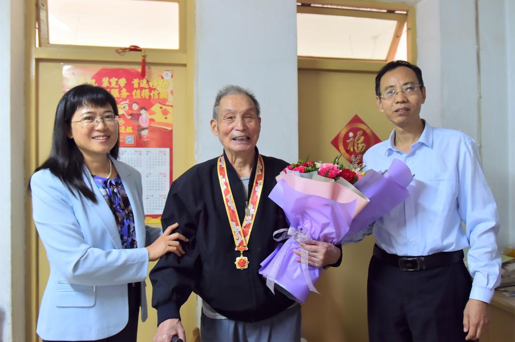陈书记与他们亲切交谈,详细了解他们的生活与身体状况,并祝愿他们健康快乐!老干部捧着纪念章,心情激动,由衷地感谢党组织对离休老干部的亲切关怀。