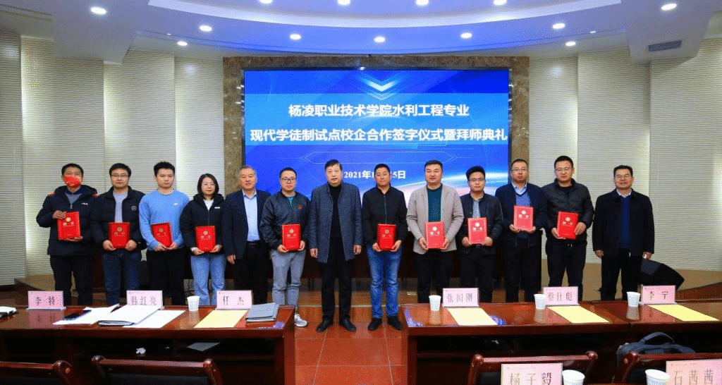 仪式上,副校长祝战斌等为11位岗位导师颁发了聘书。水利工程学院党总支书记刘儒博致辞,水利工程学院院长郝红科分别与3家企业签订了现代学徒制人才培养的合作协议。参与此次学徒计划的各位导师与他们所指导的学生合影留念。