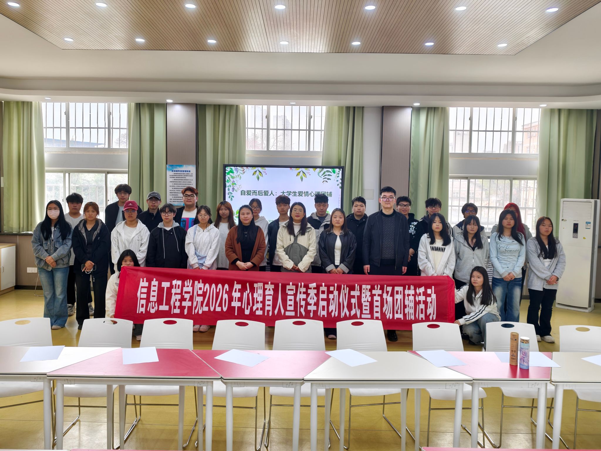 为深入推进心理育人工作,扎实开展心理育人宣传季系列活动,引导大学生树立正确恋爱观,提升情感沟通与自我认知能力,近日,信息工程学院成功举办“自爱而后爱人”大学生爱情心理团体辅导活动,由专业心理导师全程指导,学院30余名学生参加。