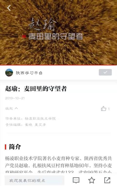 杨凌职业技术学院著名小麦育种专家、陕西省优秀共产党员赵瑜,扎根扶风豆村育种基地60年,坚持小麦育种研究至今,先后育成武农132、武农99等五个小麦品种,省内外累计推广面积8000多万亩,实现农民增收48亿元。