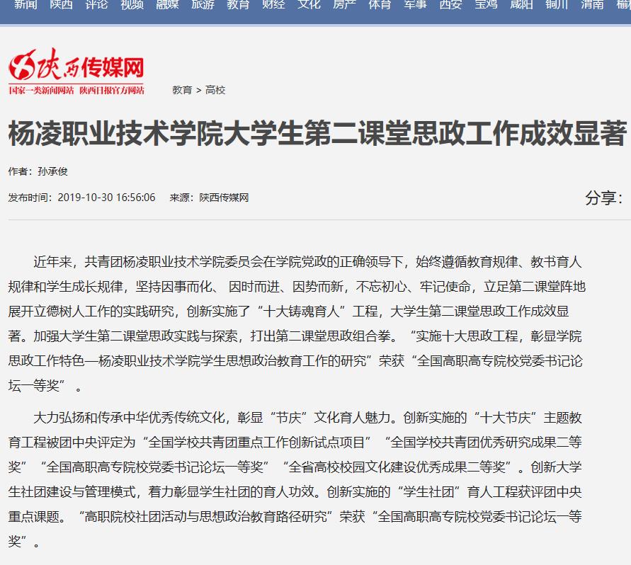 近年来,共青团杨凌职业技术学院委员会在学院党政的正确领导下,始终遵循教育规律、教书育人规律和学生成长规律,坚持因事而化、 因时而进、因势而新,不忘初心、牢记使命,立足第二课堂阵地展开立德树人工作的实践研究,创新实施了“十大铸魂育人”工程,大学生第二课堂思政工作成效显著。加强大学生第二课堂思政实践与探索,打出第二课堂思政组合拳。“实施十大思政工程,彰显学院思政工作特色—杨凌职业技术学院学生思想政治教育工作的研究”荣获“全国高职高专院校党委书记论坛一等奖” 。