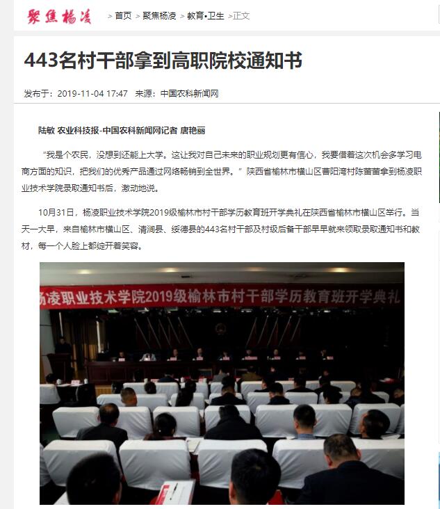 经过有益尝试,杨凌职业技术学院职业农民和村干部学历教育工作初显成效,也得到了有关方面的认可。为贯彻落实国家“高职百万扩招”专项工作任务,打造独具特色的高职教育样板,2018年10月底,陕西省委组织部、省教育厅联合印发了《关于在村干部中开展学历教育提升工作的通知》,决定从2019年起,委托该院开展全省村干部大专层次学历教育。2019年上半年,该院共收到全省各地1100余名职业农民和村干部提交的入学申请,被学院正式录取的近300名农民大学生已于9月初正式入校学习。