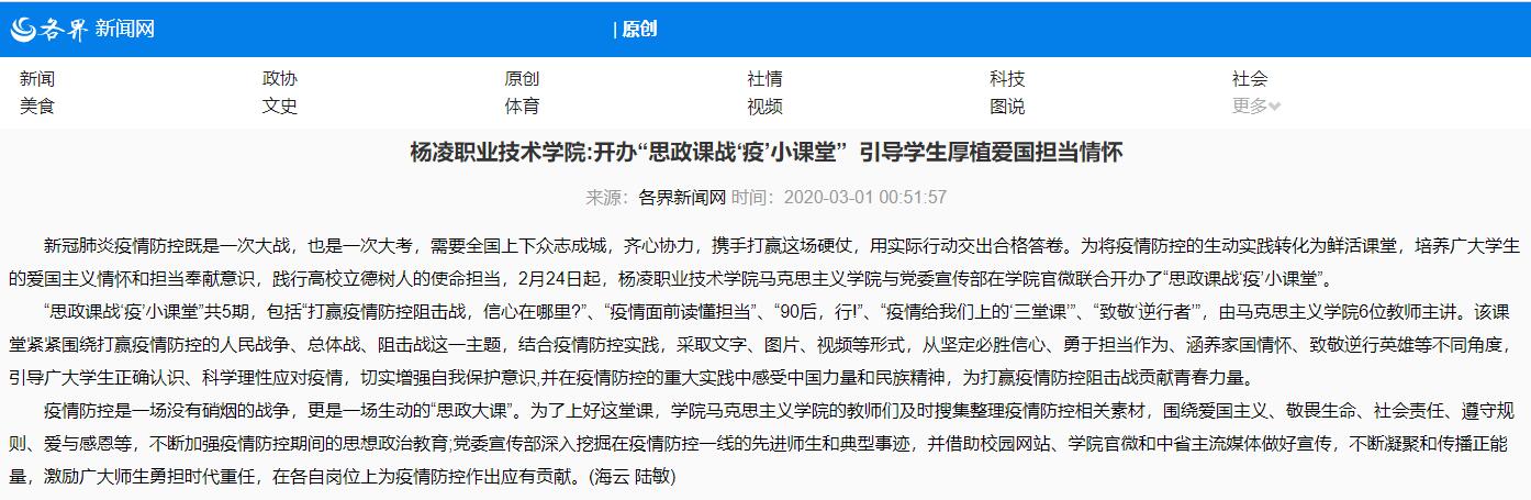 【各界新闻网】杨凌职业技术学院:开办“思政课战‘疫’小课堂” 引导学生厚植爱国担当情怀