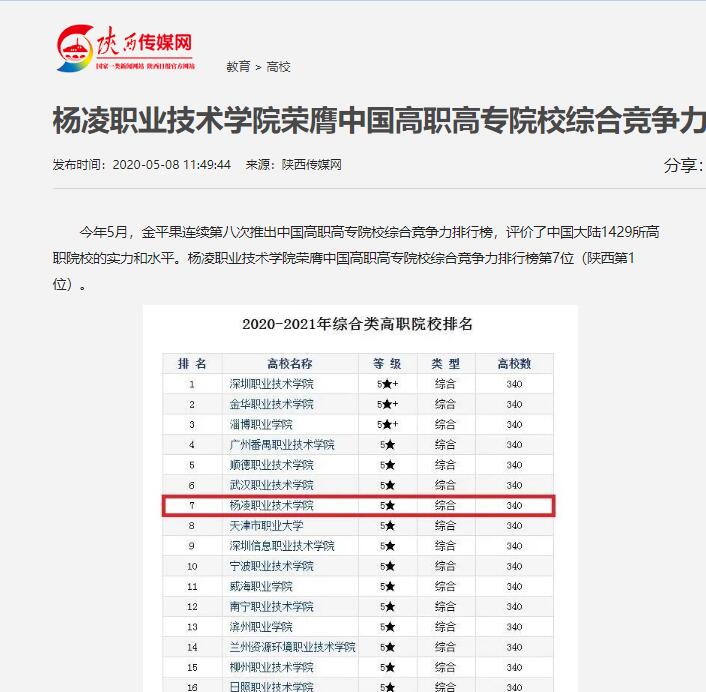 今年5月,金平果连续第八次推出中国高职高专院校综合竞争力排行榜,评价了中国大陆1429所高职院校的实力和水平。杨凌职业技术学院荣膺中国高职高专院校综合竞争力排行榜第7位(陕西第1位)。