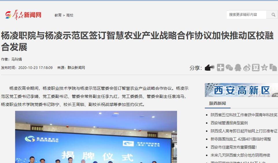 杨凌农高会期间,杨凌职业技术学院与杨凌示范区管委会签订智慧农业产业战略合作协议。杨凌示范区党工委书记李婧,党工委副书记、管委会常务副主任李九红,党工委委员、管委会副主任袁鸿马,杨凌职业技术学院党委书记陈宁、校长王周锁、副校长祝战斌等参加签约仪式。