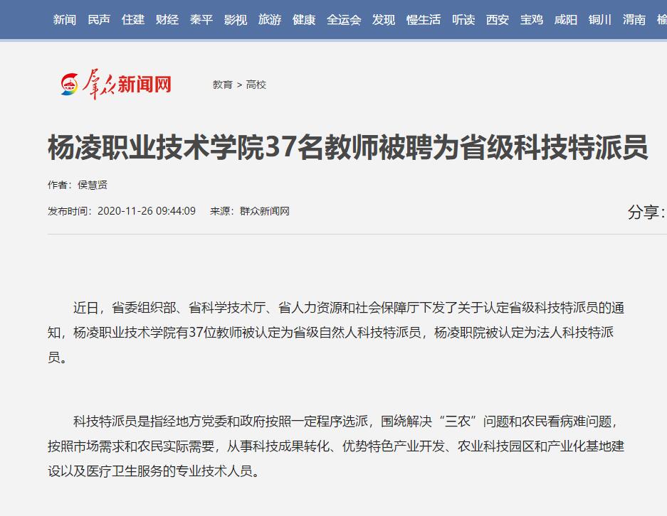 近日,省委组织部、省科学技术厅、省人力资源和社会保障厅下发了关于认定省级科技特派员的通知,杨凌职业技术学院有37位教师被认定为省级自然人科技特派员,杨凌职院被认定为法人科技特派员。
