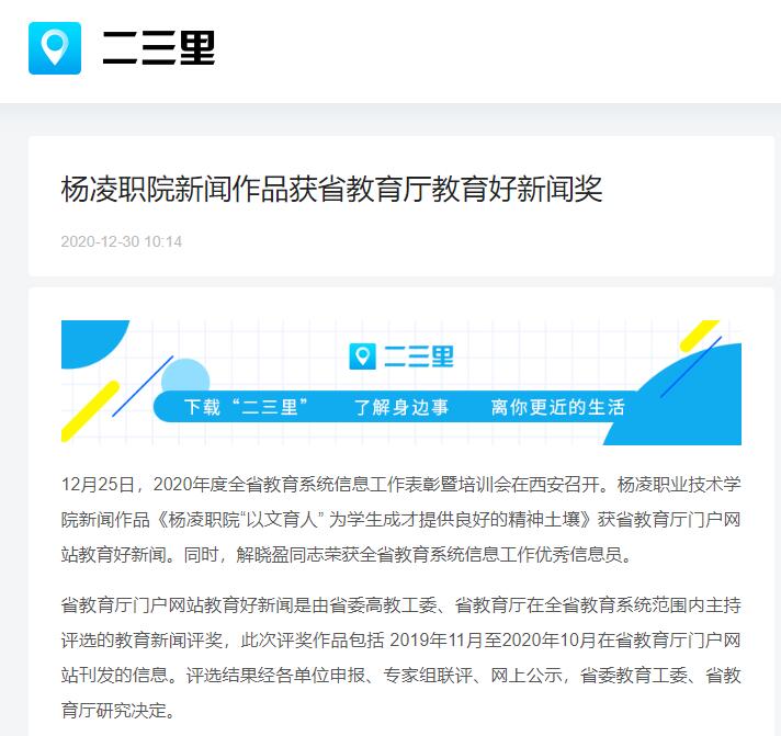 新闻作品《杨凌职院“以文育人” 为学生成才提供良好的精神土壤》,从挖掘学校文化底蕴、丰富文化育人内容、创新文化育人载体三个方面,全面、准确地反映了我校实施文化育人工程情况,由于层次清晰、内容翔实,对兄弟院校相关工作具有重要借鉴意义而获表彰。