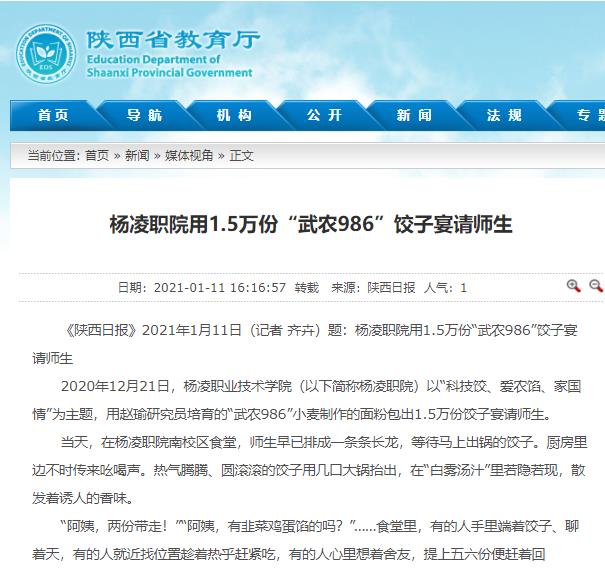 2020年12月21日,杨凌职业技术学院(以下简称杨凌职院)以“科技饺、爱农馅、家国情”为主题,用赵瑜研究员培育的“武农986”小麦制作的面粉包出1.5万份饺子宴请师生。