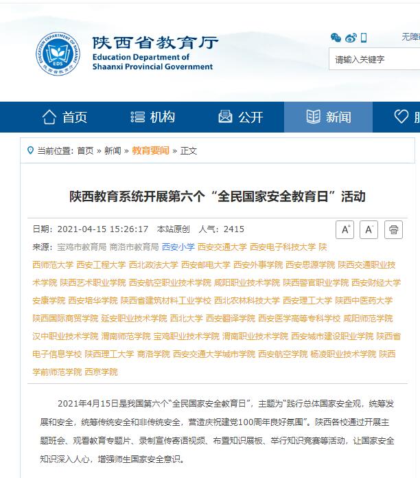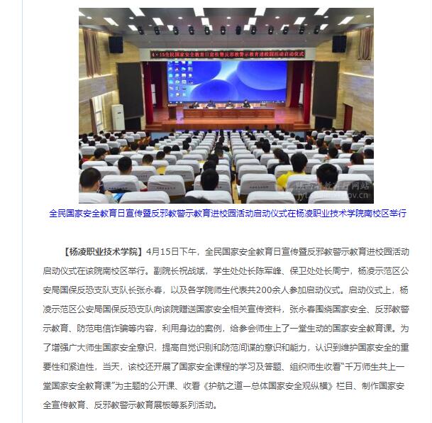 【杨凌职业技术学院】4月15日下午,全民国家安全教育日宣传暨反邪教警示教育进校园活动启动仪式在该院南校区举行。副院长祝战斌,学生处处长陈军峰、保卫处处长周宁,杨凌示范区公安局国保反恐支队支队长张永春,以及各学院师生代表共200余人参加启动仪式。启动仪式上,杨凌示范区公安局国保反恐支队向该院赠送国家安全相关宣传资料,张永春围绕国家安全、反邪教警示教育、防范电信诈骗等内容,利用身边的案例,给参会师生上了一堂生动的国家安全教育课。为了增强广大师生国家安全意识,提高自觉识别和防范间谍的意识和能力,认识到维护国家安全的重要性和紧迫性,当天,该校还开展了国家安全课程的学习及答题、组织师生收看“千万师生共上一堂国家安全教育课”为主题的公开课、收看《护航之道—总体国家安全观纵横》栏目、制作国家安全宣传教育、反邪教警示教育展板等系列活动。