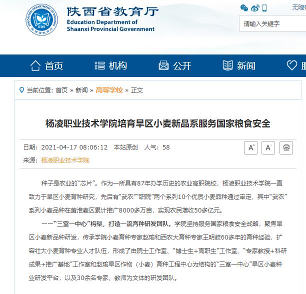 【陕西省教育厅】杨凌职业技术学院培育旱区小麦新品系服务国家粮食安全