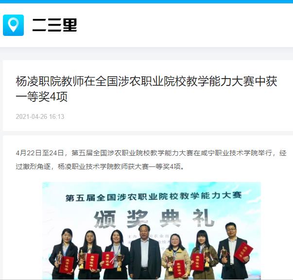 4月22日至24日,第五届全国涉农职业院校教学能力大赛在咸宁职业技术学院举行,经过激烈角逐,杨凌职业技术学院教师获大赛一等奖4项。