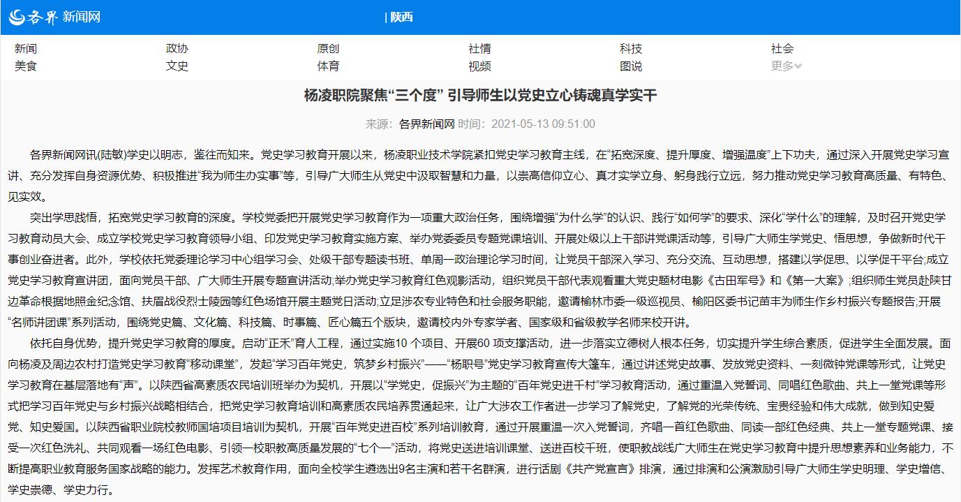 【各界新闻网】杨凌职院:聚焦“三个度” 引导师生以党史立心铸魂真学实干