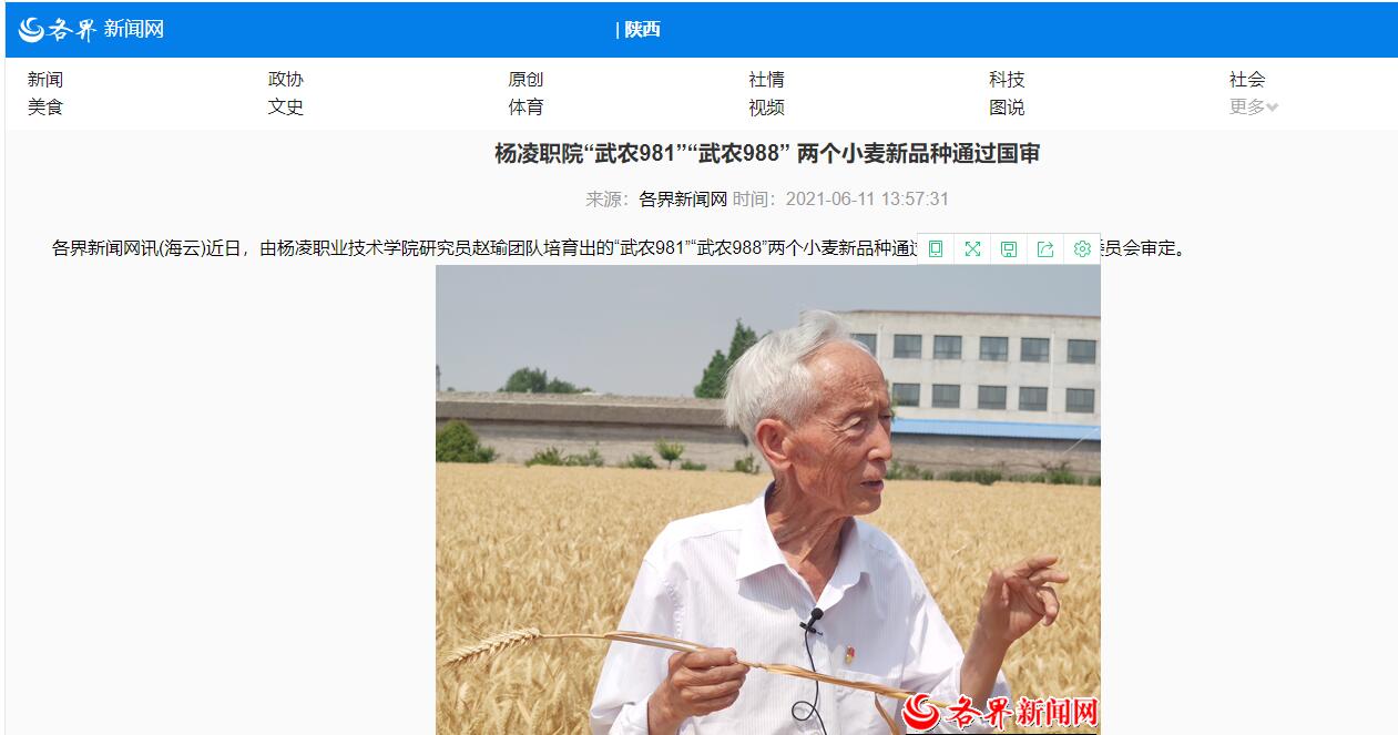 【各界新闻网】杨凌职院“武农981”“武农988” 两个小麦新品种通过国审