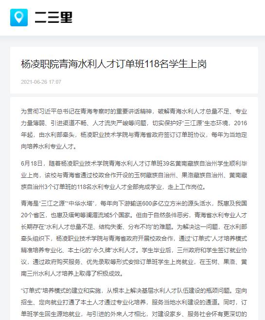 为贯彻习近平总书记在青海考察时的重要讲话精神,破解青海水利人才总量不足、专业力量薄弱、引进渠道不畅、人才流失严峻等问题,切实保护好“三江源”生态环境,2016年起,由水利部牵头,杨凌职业技术学院与青海省政府签订订单班协议,每年为当地定向培养水利专业人才。