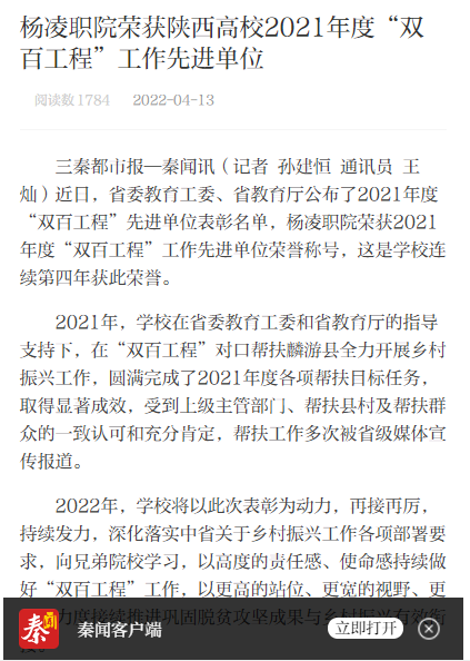 三秦都市报—秦闻讯(记者 孙建恒 通讯员 王灿)近日,省委教育工委、省教育厅公布了2021年度“双百工程”先进单位表彰名单,杨凌职院荣获2021年度“双百工程”工作先进单位荣誉称号,这是学校连续第四年获此荣誉。