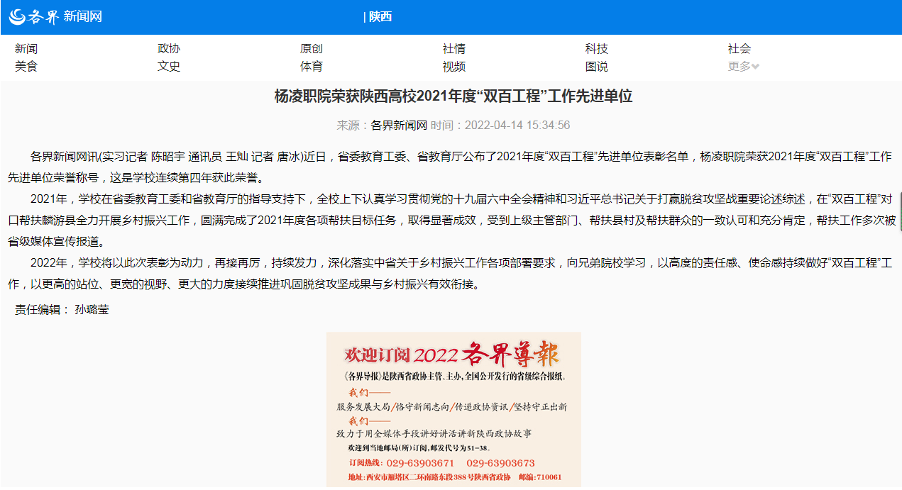 各界新闻网讯(实习记者 陈昭宇 通讯员 王灿 记者 唐冰)近日,省委教育工委、省教育厅公布了2021年度“双百工程”先进单位表彰名单,杨凌职院荣获2021年度“双百工程”工作先进单位荣誉称号,这是学校连续第四年获此荣誉。