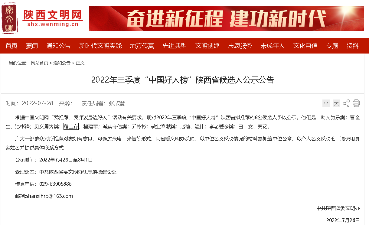【陕西文明网】2022年三季度“中国好人榜”陕西省候选人公示公告