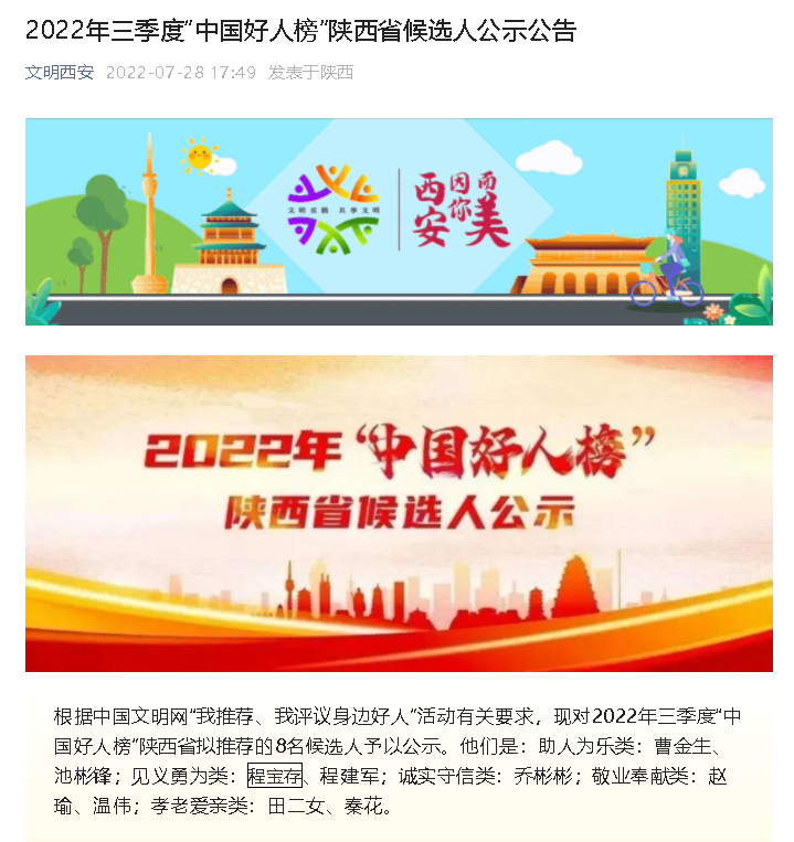 【文明西安】2022年三季度“中国好人榜”陕西省候选人公示公告