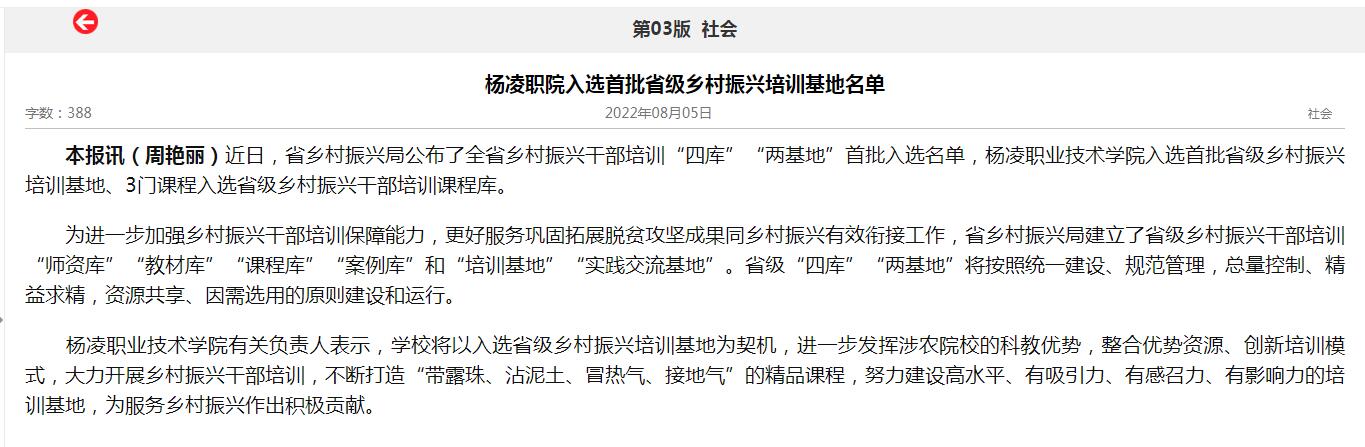 本报讯(周艳丽)近日,省乡村振兴局公布了全省乡村振兴干部培训“四库”“两基地”首批入选名单,杨凌职业技术学院入选首批省级乡村振兴培训基地、3门课程入选省级乡村振兴干部培训课程库。