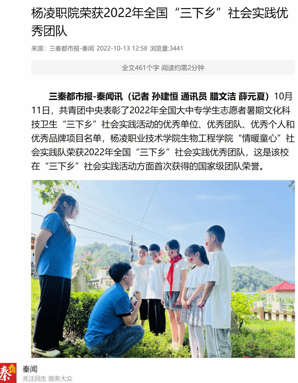 三秦都市报-秦闻讯(记者 孙建恒 通讯员 腊文洁 薛元夏)10月11日,共青团中央表彰了2022年全国大中专学生志愿者暑期文化科技卫生“三下乡”社会实践活动的优秀单位、优秀团队、优秀个人和优秀品牌项目名单,杨凌职业技术学院生物工程学院“情暖童心”社会实践队荣获2022年全国“三下乡”社会实践优秀团队,这是该校在“三下乡”社会实践活动方面首次获得的国家级团队荣誉。