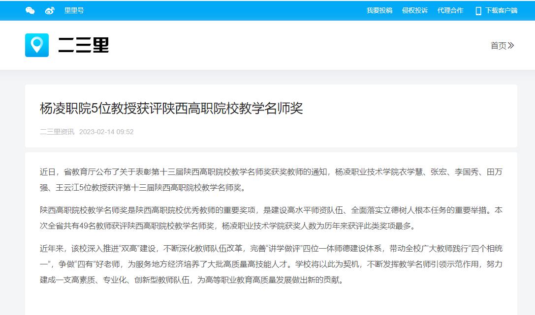 近日,省教育厅公布了关于表彰第十三届陕西高职院校教学名师奖获奖教师的通知,杨凌职业技术学院衣学慧、张宏、李国秀、田万强、王云江5位教授获评第十三届陕西高职院校教学名师奖。