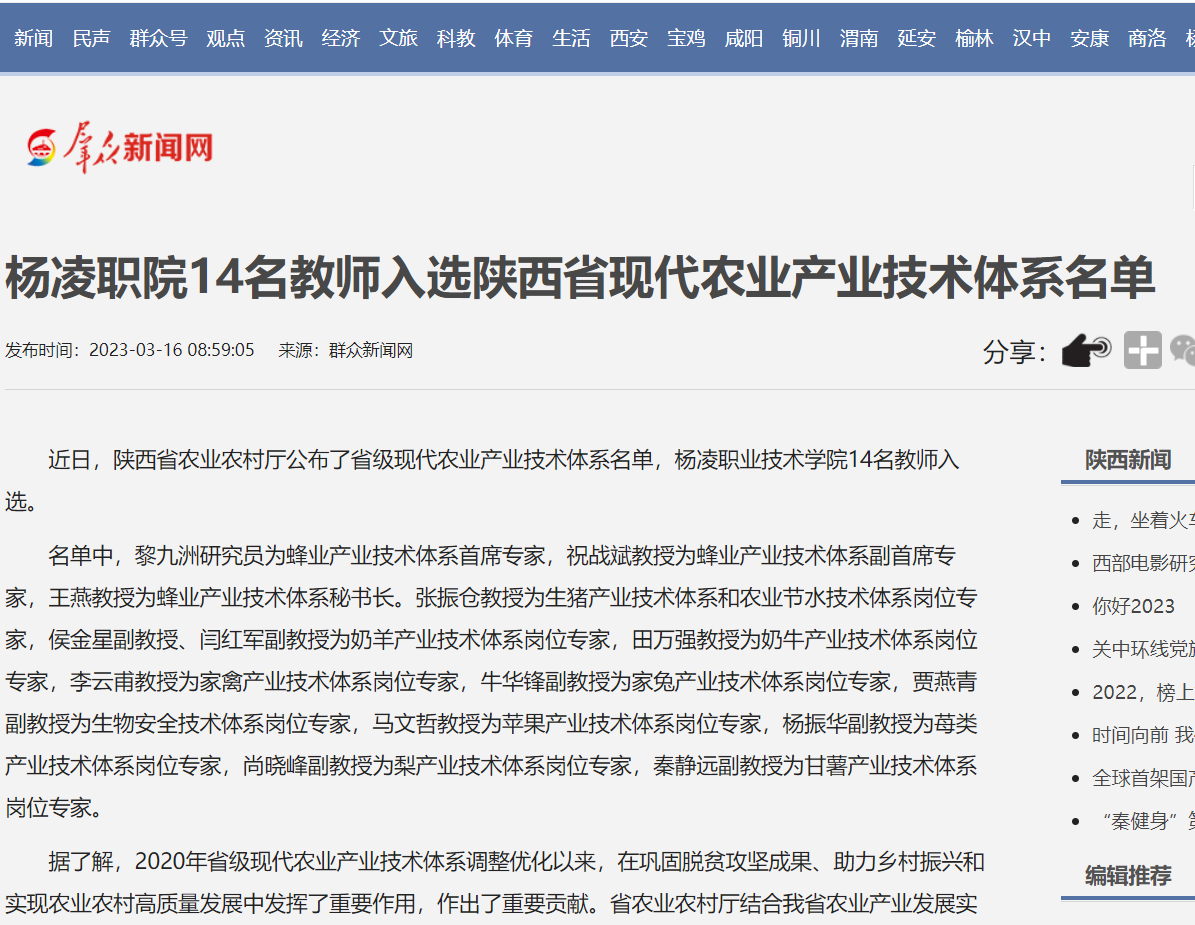 【群众新闻网】杨凌职院14名教师入选陕西省现代农业产业技术体系名单